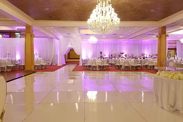 Pure white wooden dance floor with adjust pipe drape wedding decor